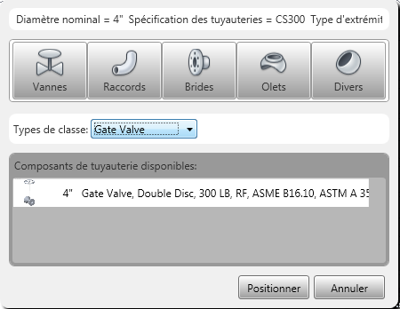 Dans la liste Composants de tuyauterie disponibles, cliquez sur un composant (p. ex. Vanne/robinet à soupape, 300LB, RF).
