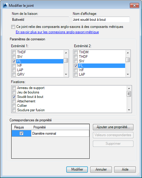 Si vous souhaitez également prendre en charge les connexions entre composants d'unités identiques, utilisez la boîte de dialogue Ajouter un joint pour ajouter une deuxième liaison avec des propriétés similaires (par exemple, ajouter MixedButtweld semblable à Buttweld).