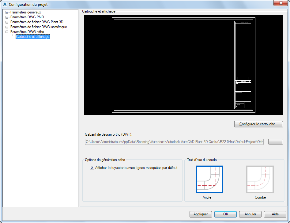 Configure les paramètres par défaut d'affichage de la tuyauterie avec lignes masquées et du trait d'axe du coude, et indique également les emplacements du dossier de sortie et du gabarit ortho.
