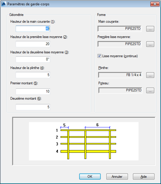 Modifie les paramètres de géométrie du garde-corps sélectionné. Les valeurs numériques indiquées entre parenthèses correspondent à la géométrie étiquetée dans l'image d'aperçu.