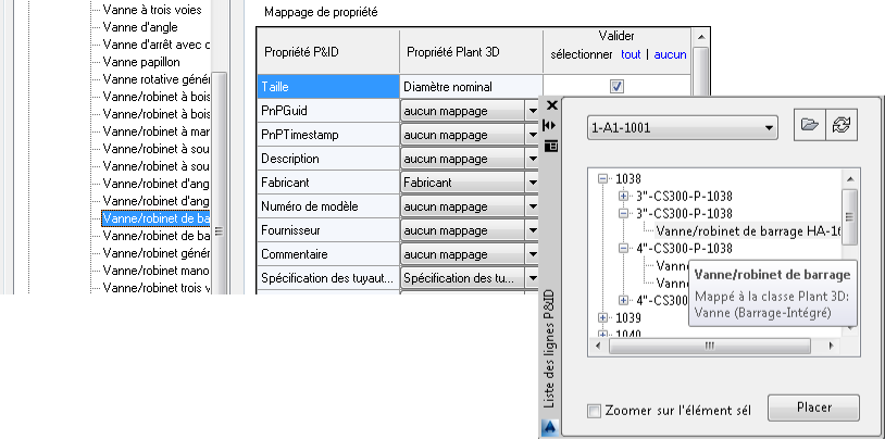 Certaines propriétés Plant 3D sont basées sur la spécification des tuyauteries et ne sont donc pas disponibles pour un mappage. Dans le volet Mappage de P&ID, sous Classes 3D, Mappage de propriété, les propriétés basées sur la spécification des tuyauteries sont signalées par un astérisque (*). Elles ne sont disponibles que pour la validation.