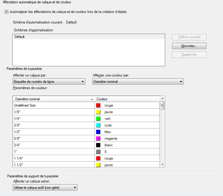 Lorsque la case à cocher Automatiser les affectations de calque et de couleur lors de la création d'objets est désactivée, les paramètres de calque et de couleur AutoCAD par défaut sont actifs.