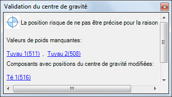 Lorsque le centre de gravité actif est activé et que vous sélectionnez un objet Plant auquel aucun poids n'est associé, une fenêtre de validation s'affiche pour identifier les composants dont le poids est manquant. La validation du centre de gravité actif n'est pas activée si aucun des composants sélectionnés n'a de poids.