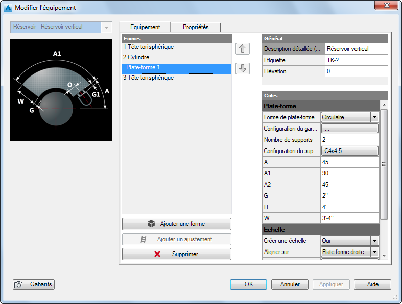 Affiche un aperçu de l'équipement. Si vous sélectionnez un équipement ayant un motif d'équipement existant, les cotes sont illustrées dans l'image d'aperçu.
