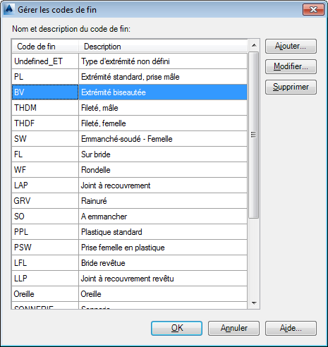 Utilisez la boîte de dialogue Gérer les codes de fin pour ajouter des codes de fin, modifier une description ou supprimer un code de fin.