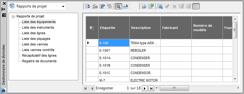 L'arborescence du Gestionnaire de données affiche les types de rapport et les rapports définis pour un projet en cours. La vue de données affiche les champs du rapport.