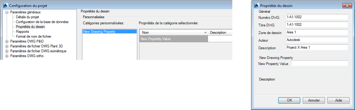 Lors de la configuration d'un projet, des propriétés peuvent être ajoutées dans la configuration du projet affichée pour chaque dessin.