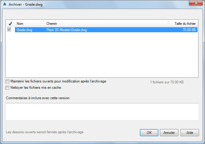 Lorsque vous fermez le dessin, il est automatiquement archivé, sous réserve que l'option d'archivage soit "Lorsque le dessin est enregistré" ou "Lorsqu'un dessin est fermé" dans la boîte de dialogue Options.