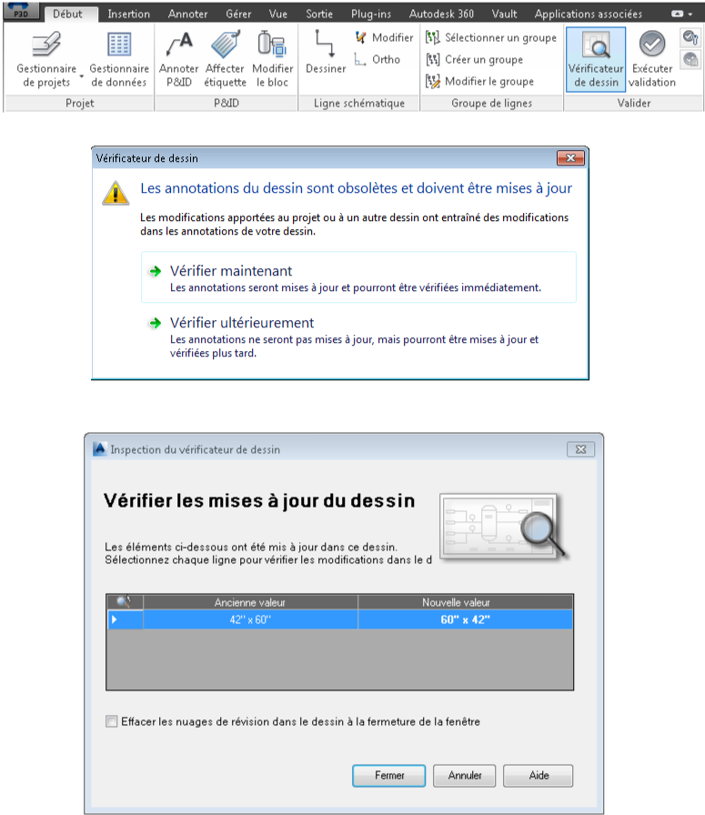 Le Vérificateur de dessin compare l'ensemble du texte et des annotations dans le dessin P&ID avec les propriétés du projet courant afin de rechercher les incohérences résultant des modifications récentes apportées en dehors du dessin. Il identifie les mises à jour du dessin courant.