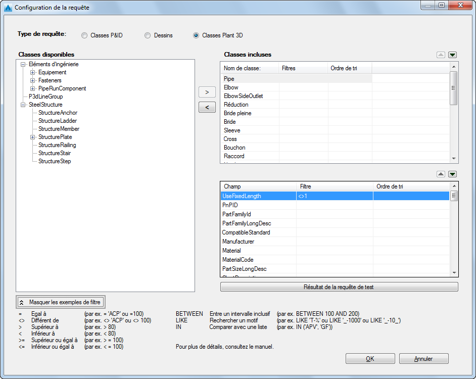 - Dans le champ Type de requête, cliquez sur Classes P&ID, Dessins ou Classes Plant 3D.