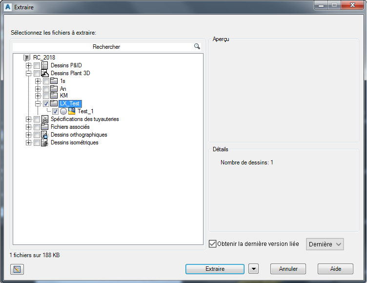 - Dans l'arborescence du gestionnaire de projets, cliquez sur un dessin avec le bouton droit de la souris. Cliquez sur Extraire.