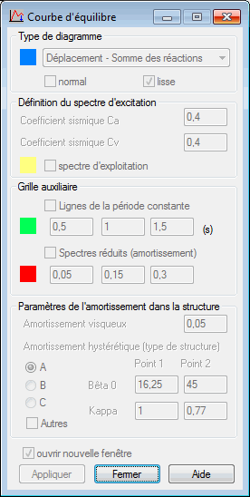 Dans la zone Définition du spectre d'excitation, vous pouvez définir le spectre d'exploitation (spectre des mouvements du sol lors d'un tremblement de terre). Le spectre d'exploitation est défini à l'aide des coefficients sismiques Ca et Cv. (voir norme ATC-40, chapitre 4). Si l'option Spectre d'exploitation est cochée, un diagramme créé à partir des intersections des lignes de période constante affiche le spectre réduit correctement calculé.