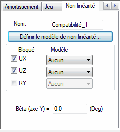 Remarque : Le modèle de non-linéarité contient les informations sur le degré de liberté (déplacement ou rotation). Les modèles sont donc filtrés. En d'autres termes, le modèle de non-linéarité ayant le type force-déplacement défini, n'est pas visible dans les listes de sélection pour RX, RY et RZ.