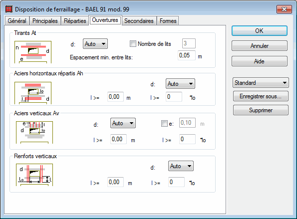 Ce type d’armatures est mis en place dans la partie inférieure et supérieure de l’ouverture, à la hauteur égale à la largeur de l’ouverture. La zone d'armatures calculée est indépendante de la section d’acier des armatures réparties de la poutre-voile.