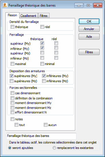 Vous pouvez sélectionner les grandeurs dont les valeurs seront affichées dans le tableau des résultats pour l'armature théorique des barres composant la structure.