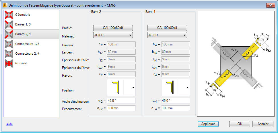 L'onglet Barres 2, 4 comprend les options permettant de définir les principaux paramètres des barres aboutissant au gousset qui se trouvent sur les lignes 2 et 4 :