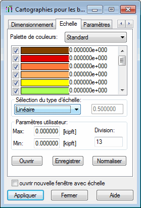 La palette de couleurs peut être enregistrée dans un fichier (bouton Enregistrer), chargée à partir d’un fichier (bouton Ouvrir) ou normalisée (bouton Normaliser). La normalisation de l’échelle consiste en ce que le logiciel ajustera l’échelle à la valeur sélectionnée en prenant la valeur minimale et maximale de la grandeur sélectionnée pour les limites des variations de l’échelle.