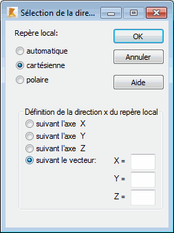 La boîte de dialogue Sélection de la direction contient les définitions de repère local suivantes :