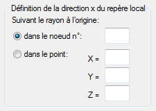 - Polaire - Si vous sélectionnez cette option, le repère local sera pris suivant le repère polaire défini par l'utilisateur d'une façon globale pour tous les panneaux. Ces options permettent de définir l'origine du repère : point aux coordonnées données ou numéro du nœud.