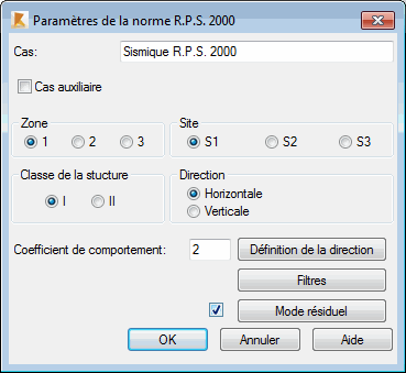 Les paramètres de l’analyse sismique des structures dépendent de la norme parasismique sélectionnée pour le calcul des structures sollicitées par des charges sismiques. Sélectionnez la norme parasismique marocaine RPS 2000 dans la boîte de dialogue Définition d'un nouveau cas ou cliquez sur le bouton Paramètres dans la boîte de dialogue Type d'analyse.