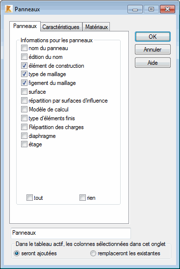 Utilisez la boîte de dialogue Panneaux pour sélectionner les informations relatives aux panneaux qui s'affichent dans le tableau.