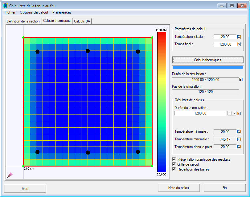 Cliquez sur Calculs pour lancer les calculs thermiques d'une section. Le déroulement des calculs est présenté graphiquement dans la section transversale d'un élément BA (l’option Présentation graphique des résultats doit être cochée). La progression des calculs est indiquée par la barre de progression et le changement des valeurs du temps et de l'étape de la simulation (cf. Paramètres des calculs thermiques).