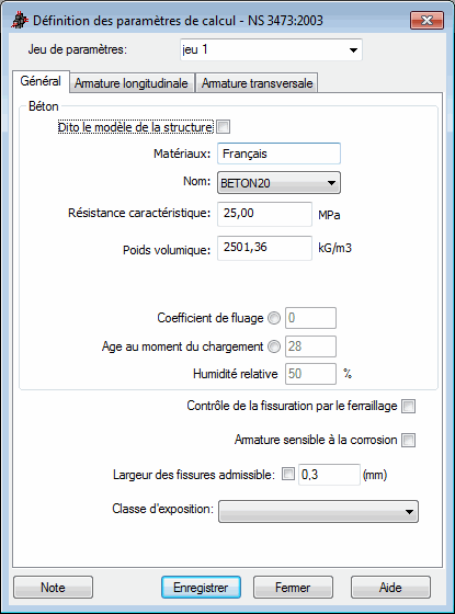 L'onglet Général de la boîte de dialogue Définition des paramètres de calcul pour la norme norvégienne NS 3473.