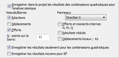 L'option Enregistrer dans le projet les résultats des combinaisons quadratiques pour l'analyse sismique est désactivée par défaut. Dans ce cas, les autres paramètres de la boîte de dialogue Analyse sismique ne peuvent pas être définis, à l'exception de l'option Enregistrer les résultats moyens pour EF.