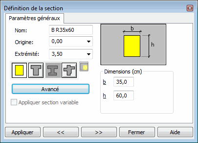 Dans le champ Dimensions de base, vous devez définir les dimensions de la section transversale.