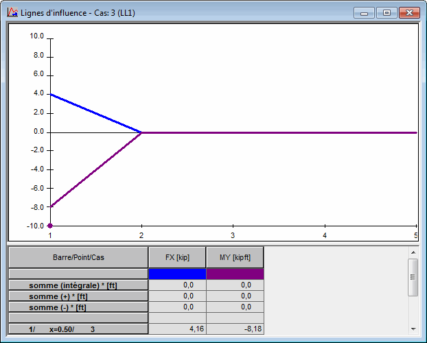 la partie supérieure du tableau pour l’analyse des charges roulantes affiche la valeur de l’intégrale des diagrammes présentés sur la vue. Les valeurs des intégrales suivantes sont affichées :
