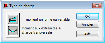 Lors des calculs automatiques, quand le type de charge est modifié lors de la modification du cas de charge, le logiciel prend par défaut la barre à deux moments aux extrémités. Pour les calculs automatiques, l'option par défaut est Moment constant (Linéaire). Après la sélection manuelle du cas de charge ou la saisie de la valeur des efforts internes, vous pouvez définir exactement le type de charge.