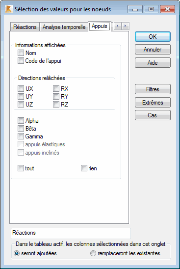 Dans le cas où la boîte de dialogue est ouverte à partir du tableau Appuis, les options suivantes sont disponibles :