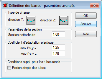 Cette option sert à définir les paramètres réglementaires avancés du type de barre acier. La boîte de dialogue est accessible après la sélection de l’icône Plus affichée dans la boîte de dialogue Définition des barres - paramètres.