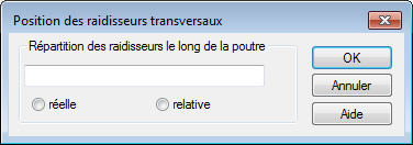 La boîte de dialogue ci-dessus permet de définir la distribution des raidisseurs transversaux sur la longueur de la poutre (dans des coordonnées réelles relatives par rapport à la longueur de la poutre).