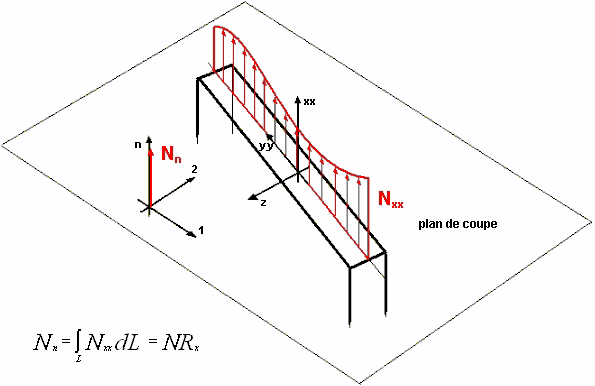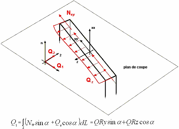 Dans une coupe, il est possible de réduire tous les efforts à un point (le contre de gravité de tous les éléments dans la coupe). Le système de coordonnées dans lequel les efforts réduits sont affichés résulte de la définition d'une coupe : axe n - la normale au plan de coupe, les axes 1 et 2 sont placés dans le plan de coupe.
