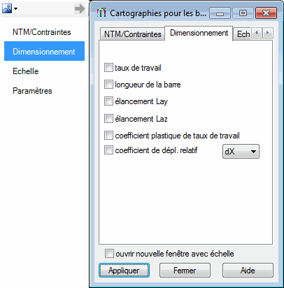 Pour prendre en charges plusieurs onglets, certaines boîtes de dialogue contiennent des onglets disposés le long de leur bord gauche. C'est le cas, par exemple, de la boîte de dialogue Cartographies pour les barres.