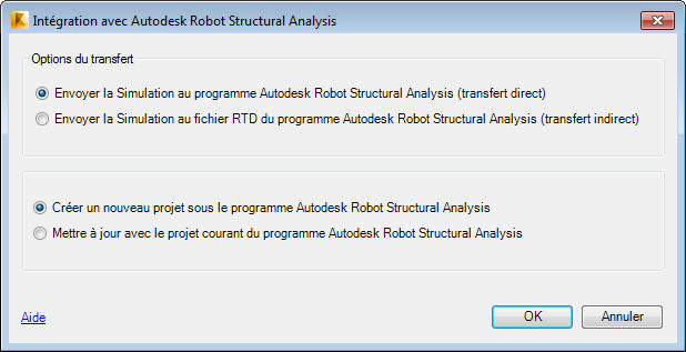 - Envoyer la Simulation au programme Autodesk Robot Structural Analysis (transfert direct) - crée le modèle de calcul directement dans le programme Robotà partir de la Simulation courante dans le module FA. L'option n'est pas accessible, si le programme Robot n'est pas installé.
