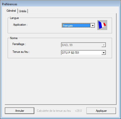 L’onglet Général de la boîte de dialogue Préférences permet de sélectionner la langue de la calculatrice de tenue au feu.