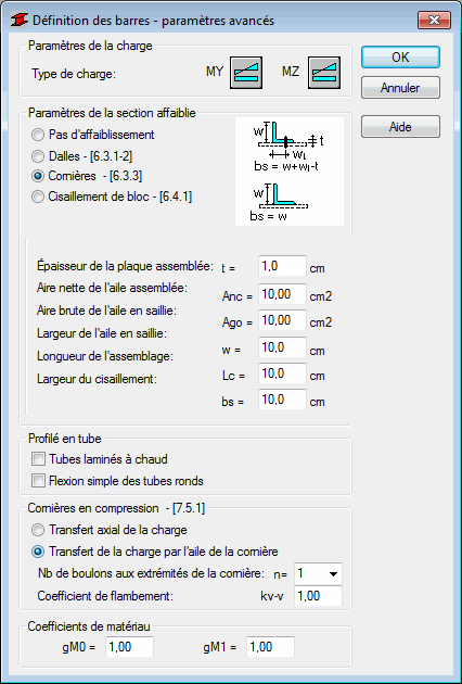 les cornières peuvent être soumises à la compression axiale ou la charge peut être transmise sur l’aile de la cornière ; dans ce dernier cas, il est possible de définir les valeurs du coefficient de longueur de flambement kv-v par l’utilisateur ; la valeur du paramètre de l’élancement de la barre λe = f(kv-v) est alors interpolée entre les valeurs λe correspondant à la solution pour l’encastrement bilatéral et pour la rotule bilatérale (la valeur kv-v doit être comprise dans l’intervalle de 0,65 pour l’encastrement bilatéral de la barre jusqu’à 1.0 pour la rotule bilatérale)