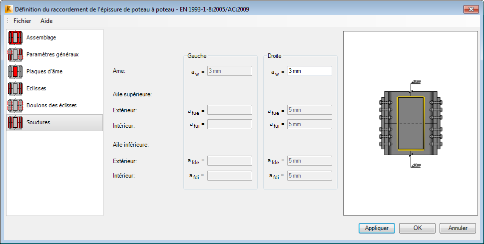 Utilisez le groupe de fonctions Soudures pour définir l'épaisseur des soudures raccordant les plaques aux barres.