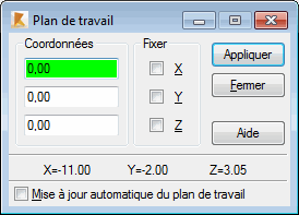 Dans la partie inférieure de la boîte de dialogue, le logiciel affiche les coordonnées de la position actuelle du pointeur et l’option Mise à jour automatique du plan de travail. Si cette option est cochée, le point définissant le plan de travail est déterminé dans cette boîte de dialogue (et il ne change pas lors de la définition des éléments de la structure). Le logiciel prend le dernier point défini comme le point de travail (p. ex. l’extrémité de la barre définie). Si l’option Mise à jour automatique du plan de travail n’est pas cochée, le point définissant le plan de travail est déterminé dans la boîte de dialogue (et il ne change pas lors de la définition des éléments de la structure).