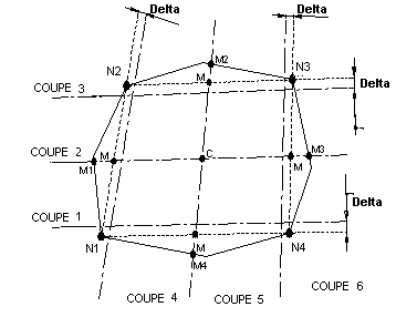 Afin que les sections transversales 1, 3, 4 et 6 soient bien définies à l’intérieur des panneaux (manque de précision des coordonnées), il faut les décaler d’une valeur Delta par rapport aux nœuds principaux des panneaux N1, N2, N3 et N3. La valeur delta est égale à la valeur de la tolérance utilisée dans la génération du modèle de calcul.