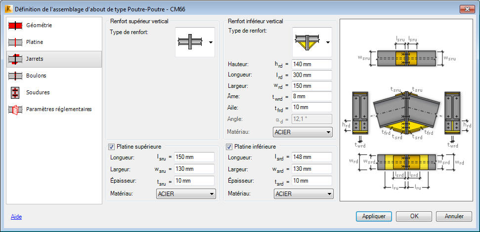 Après l'activation de l'option Platine supérieure ou Platine inférieure, il est possible de définir des platines additionnelles entre les ailes de la poutre et la platine d'about. Pour chaque type de renfort, il faut définir les paramètres suivants :