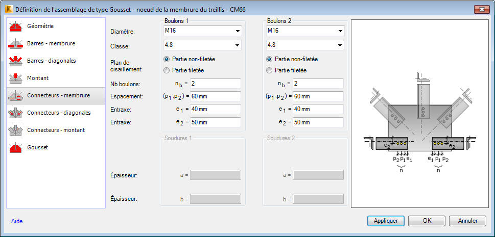 - Les paramètres des soudures utilisées pour assembler une barre au gousset (si l'assemblage soudé a été choisi).