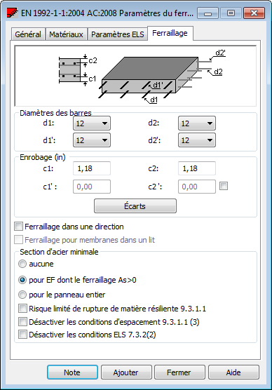 Vous pouvez également définir des paramètres supplémentaires pour le contrôle d'armature minimal, qui peuvent être disponibles pour les normes ACI 318 et EN 1992-1-1:2004 AC:2008 avec toutes leurs Annexes nationales.