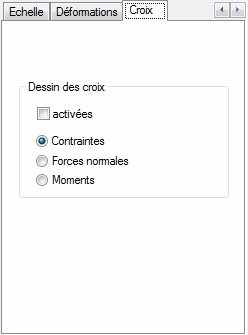 Les résultats pour les éléments finis surfaciques peuvent être présentés sous forme d’isolignes (cartographies) ou sous forme de croix. Pour la grandeur sélectionnée, les croix seront présentés si la case Activées est cochée. Les résultats sous forme de croix peuvent être présentées pour trois grandeurs, à savoir Contraintes, Forces normales et Moments.