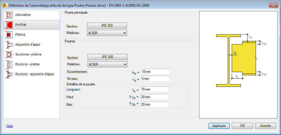 Sur l'onglet Profilés, vous pouvez définir les profilés de la poutre principale et de la poutre dans l'assemblage.