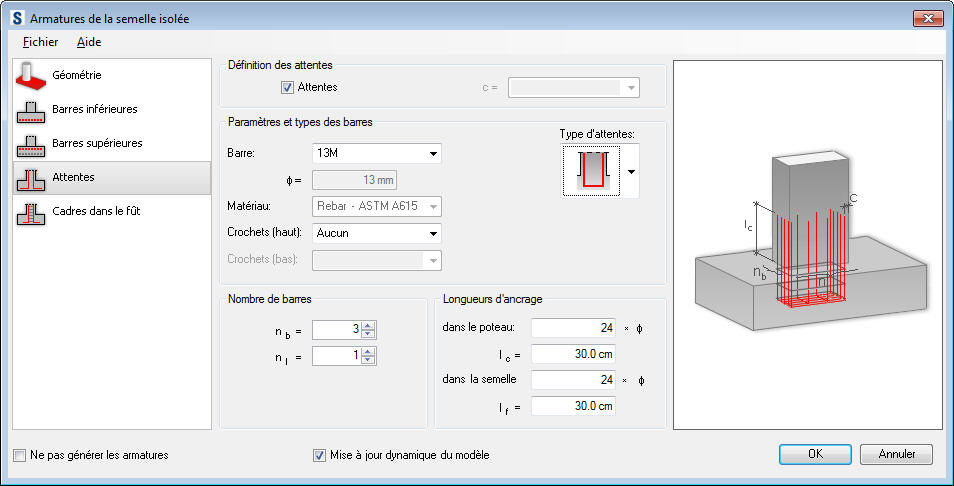 Pour générer une armature par attente dans une semelle isolée, sélectionnez Attentes sous Définition des attentes. Vous pouvez ensuite définir les paramètres de l'armature :