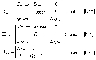 Les valeurs de rigidité relatives aux directions de l'orthotropie sont définies par les matrices générales ci-dessous :