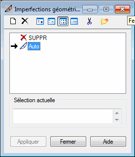 pour ouvrir la boîte de dialogue permettant de définir un nouveau type d'imperfection. Les champs proposent les paramètres de la dernière imperfection saisie (sauf le champ NOM) soit les paramètres par défaut.